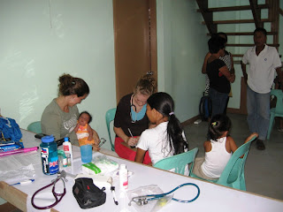Once we were available, Kendra and I (as well as a few other girls) would take the next available patients. These three were all not feeling well. The baby was very out of it and it took a lot of stimulation to get her to cry. She had a very high fever and was severely dehydrated. The little girl we are guessing had Dengue. She had a terrible headache and kept hitting herself in the head it hurt so badly. She also had a UTI. The mom, we think, just had a cold.